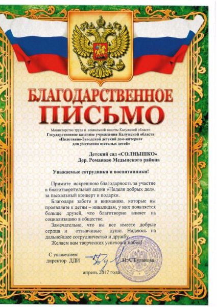 17 апреля наш детский сад ездил с концертом и подарками для воспитанников в «ГКУ Калужской области «Полотняно-Заводской дом-интернат».